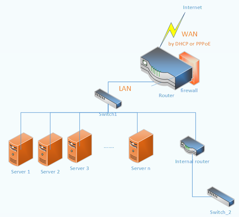 如果服务器主机设备不是直接安装在有外部IP地址的网络上(也就是服务器主机可以直接设置外部IP地址在网络接口中),基本且简易并可达到一定程度的安全要求是安装在连接外部网络的路由器下的内部的”第一层”局域网络 (如下图)中,这个 “连接外部网络的路由器” 的 WAN 是通过DHCP 或 PPPoE 取得一个外部网络的 IP地址。