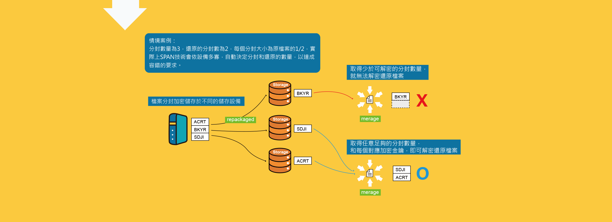 每个封装的档案都各有一个加密金钥,且档案大小会只有原来的 1/k,且 n-k >0,n-k 的值就是代表档案还原的容错数,